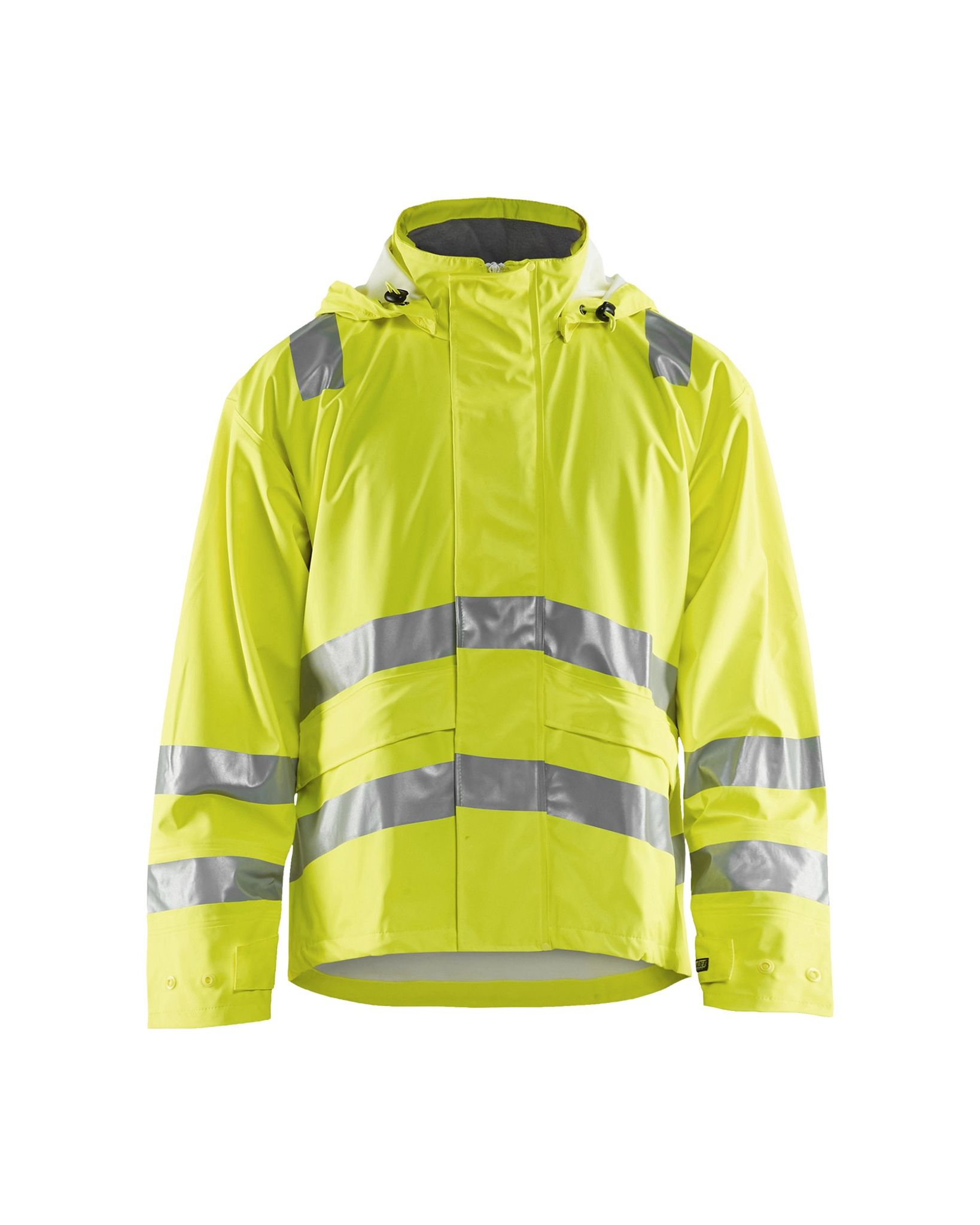 Klara av blöta dagar i denna helt vattentäta, PU-belagd regnjacka i multinorm. Svetsade sömmar och inbyggd ventilation garanterar en torr och skön arbetsdag. Regnjacka med bra ventilation i ryggen som transporterar bort fukt. Avtagbar huva med dragsko. Reflex över skuldror. Certifierad enligt EN 343 klass 3,1 mot dåligt väder. EN ISO 20471, klass 3, skyddskläder med hög synbarhet. EN ISO 14116, index 1 mot hetta och flamma och EN 13034 PB [6] skyddskläder mot kemiska vätskor.